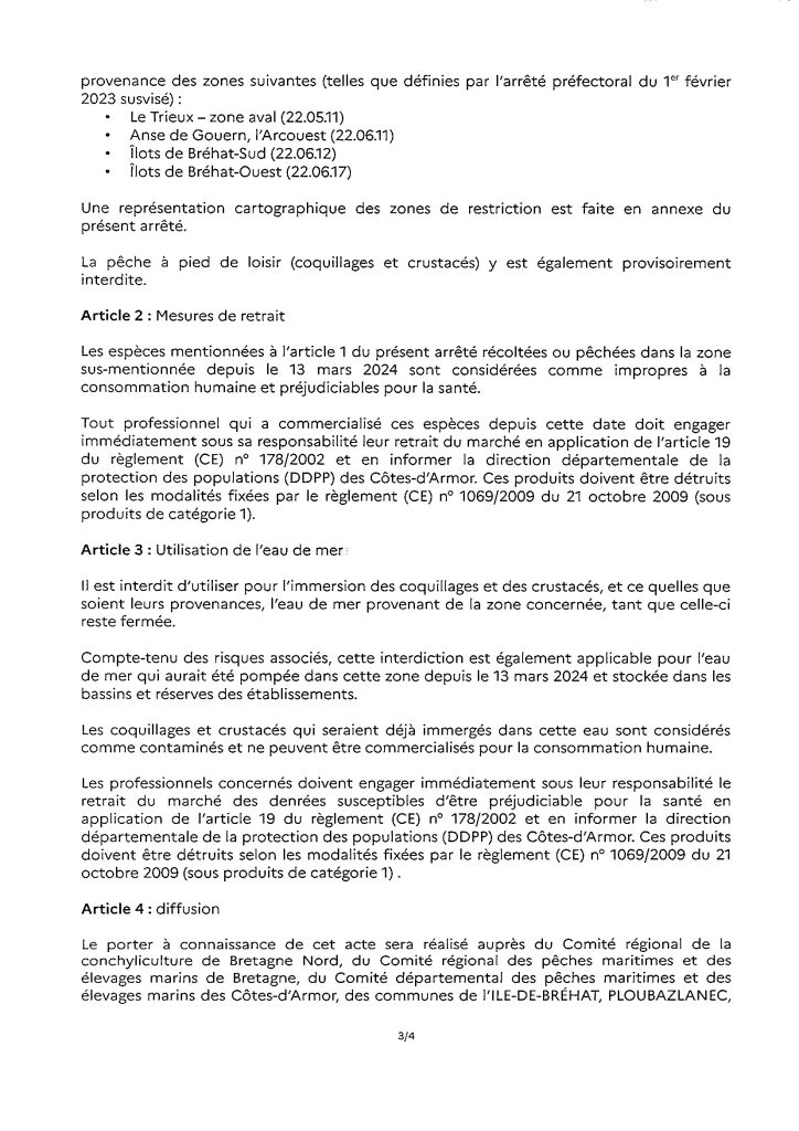 Arrêté portant interdiction temporaire de la pêche, du ramassage, du transport, de l’expédition, de la commercialisation et de la mise à la consommation humaine de toutes espèces de coquillages et de crustacés en provenance de plusieurs secteurs de l’estuaire du Trieux