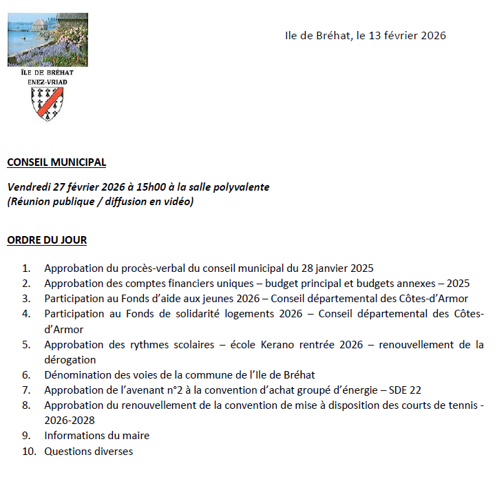 Conseil municipal : Lundi 24 novembre 2025 à 15h45 à la salle polyvalente