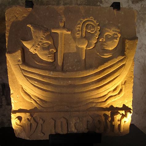 St Riom et St Maudez arrivant en bateau. Sculpture d’un chapiteau figurant à l’Abbaye de Beauport