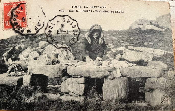 St Riom serait arrivé avec St Maudez dans une auge en pierre. En fait il s’agissait de bateaux légers, avec une armature en bois recouverte de peaux de bœuf graissées, le tout lesté d’une pierre ayant la forme d’une auge. Seul le lest a survécu. Ces bateaux, des cunnaghs, sont encore en vigueur en Irlande. Un aventurier britannique a traversé l’Atlantique sur ce genre de bateau en 1977.